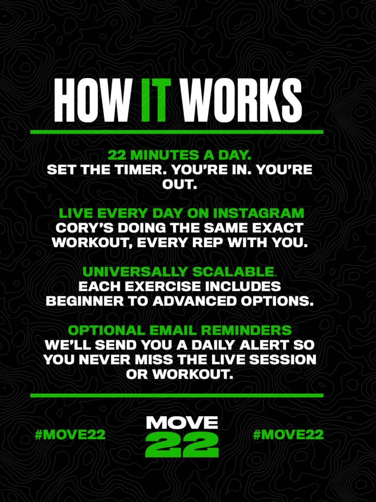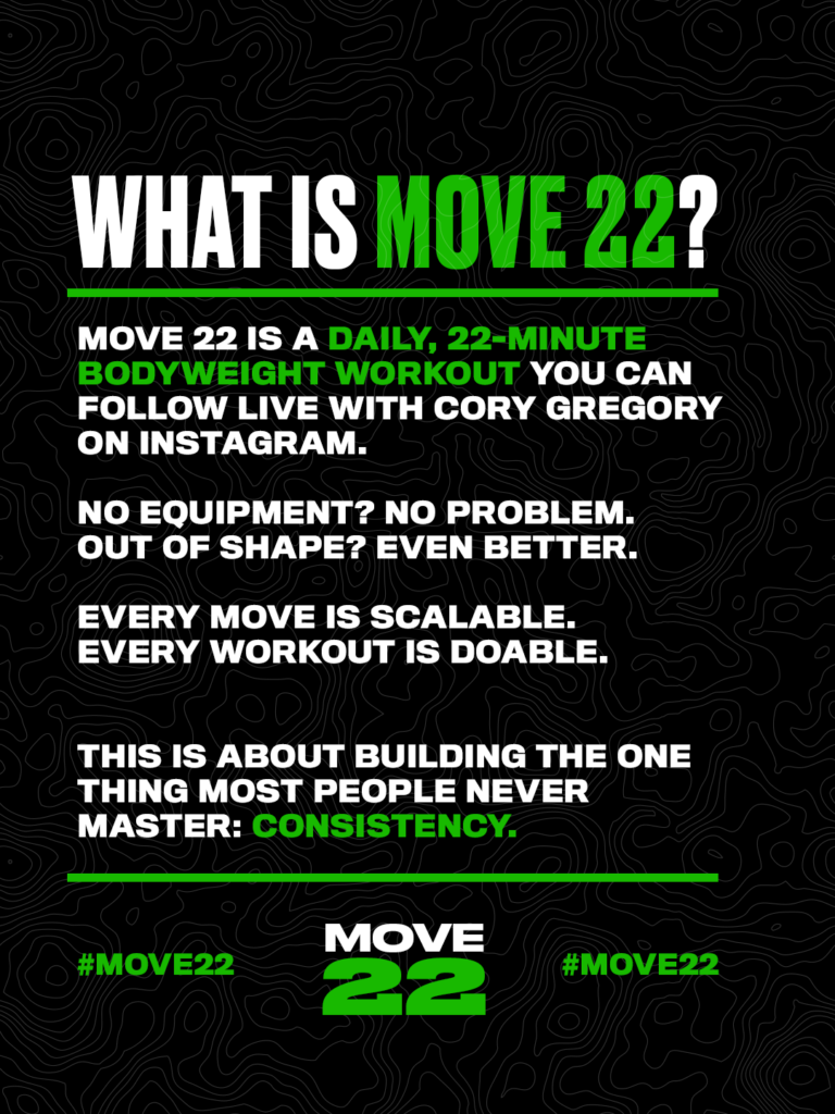 It’s a free 22-day workout challenge with Cory Gregory. Just 22 minutes a day. Cory goes live on Instagram daily—so you follow along, get it done, and build momentum.