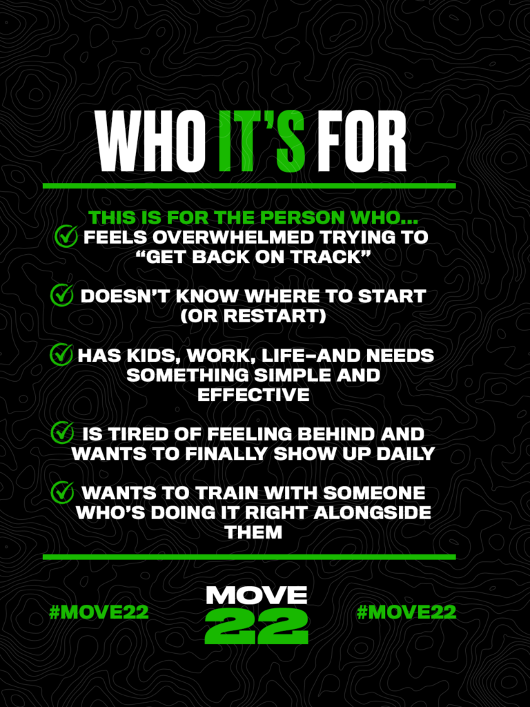This free program is for anyone ready to stop overthinking and start moving. Whether you're a busy parent, out of shape, or just stuck in a rut… MOVE 22 is your lifeline.